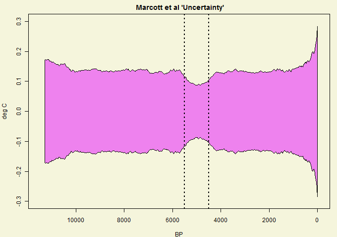 Very early in discussion of Marcott, several readers questioned how Marcott “uncertainty” in the mid-Holocene could possibly be lower than uncertainty in recent centuries. In my opinion, the readers are 1000% correct in questioning this supposed conclusion. It is the sort of question that peer reviewers ought to have asked. The effect is shown below (here uncertainties are shown for the Grid5x5 GLB reconstruction) – notice the mid-Holocene dimple of low uncertainty. How on earth could an uncertainty “dimple” arise in the mid-Holocene?