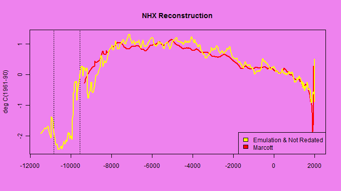 Marcott et al archived an alkenone reconstruction. There are discrepancies between the above emulation and the archived reconstruction, a topic that I’ll return to on another occasion. (I’ve tried diligently to reconcile, but am thus far unable. Perhaps due to some misunderstanding on my part of Marcott methodology, some inconsistency between data as used and data as archived or something else.) However, I do not believe that this matters for the purposes of using my emulation methodology to illustrate the effect of Marcott-Shakun re-dating.